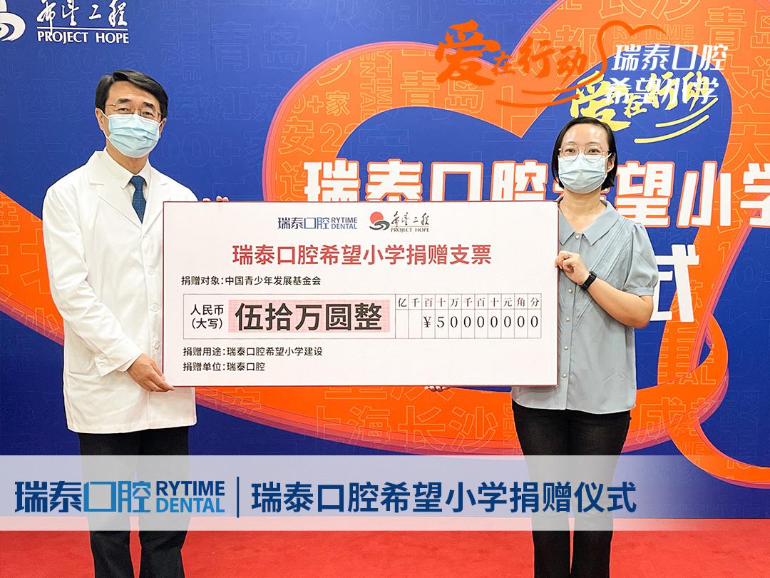 根据第四次全国口腔健康流行病学调查结果显示:我国5岁儿童的乳牙患龋率为70.9%,比十年前上升了5.8个百分点。12岁儿童的恒牙患龋率达到34.5%,比十年前上升了7.8个百分点,儿童龋患情况呈现上升态势。尤其在一些偏远地区,由于口腔健康教育资源匮乏,家长监督指导缺失,口腔保健意识更是落后于全国平均水平。为了帮助更多青少年健康成长,瑞泰口腔通过“希望工程”项目,捐助建设一所希望小学,并命名为“瑞泰希望小学”。2021年8月13日,瑞泰口腔完成相关捐赠流程,并获得了由中国青少年发展基金会颁发的公益捐赠证书。