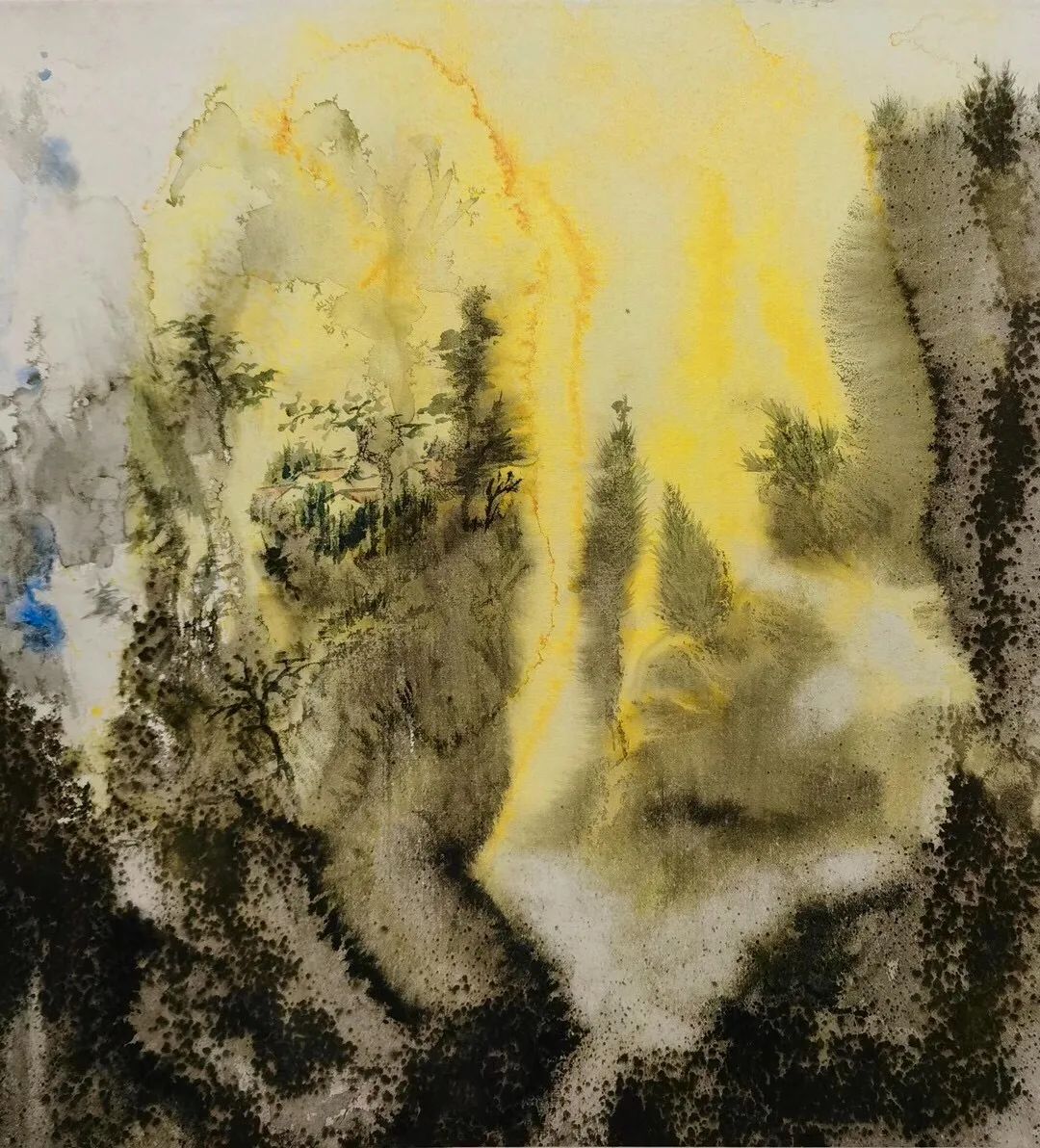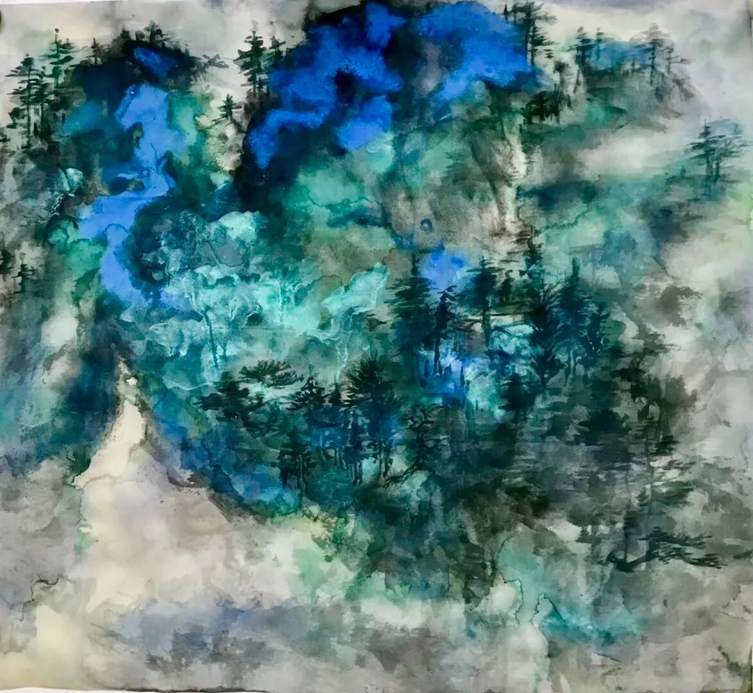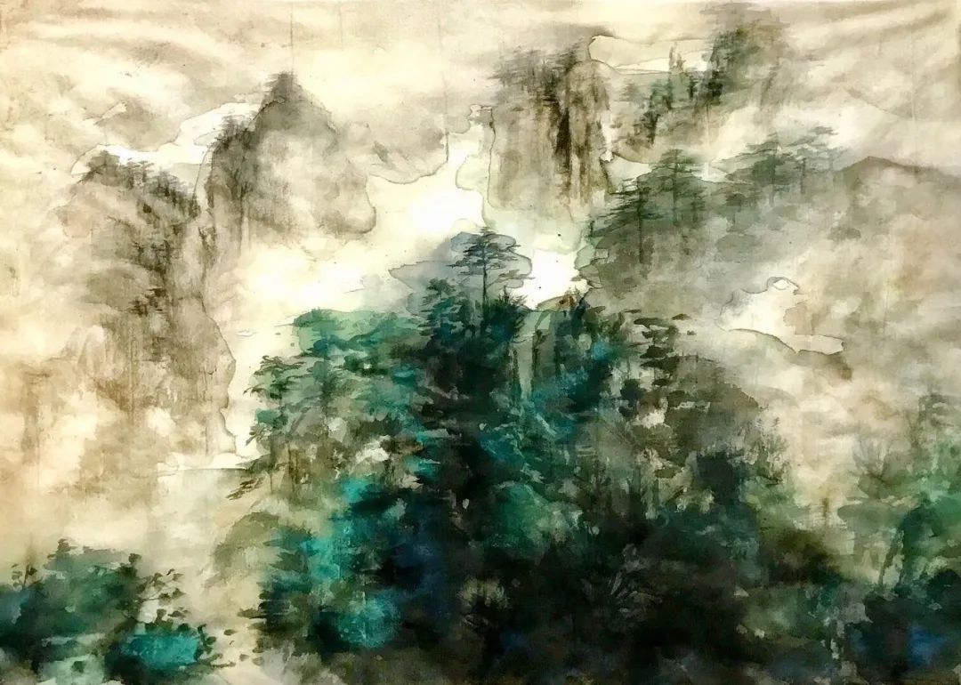 更难得的是,他是在绢画上泼彩。常常有人看他的画看呆掉:你是如何做到的?在绢上这样泼墨泼彩、兼工带写,色彩是如何控制的?水墨的肌理效果是如何达到的?他总是胸有成竹:那种浓淡枯湿,都是自然流淌而出,甚至在绘画中途会根据墨彩效果随时变换手法:泼洒、渲染、沉渍、重叠......营造出流动变幻、千姿百态的山岚云雾、气韵流溢,与客观上大自然的山势水气幻象、心象有机相融,完美合一。他说:“我希望我的每一张画都有价值。你在我的每张画上,都能看到古气、雅气、逸气,这是跟别人不一样的。”