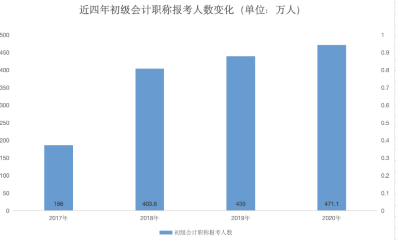 以初级会计职称考试报名人数为例,自2017年取消会计从业资格证书以后,之后三年初级会计考试报名人数呈现逐年增长的状态。2018年,报名人数403.6万人,2019年439万人,2020年471.1万人。