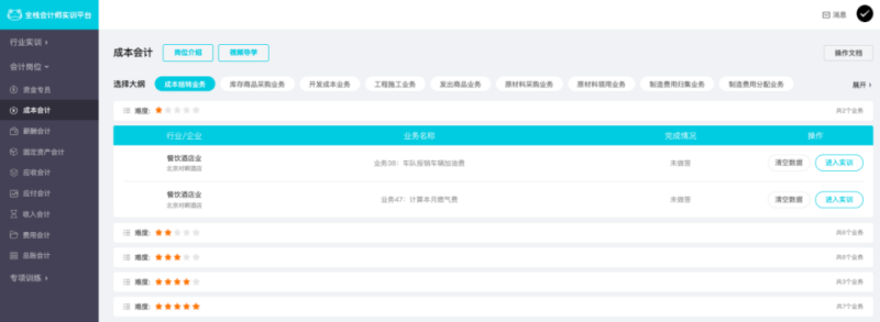 以收入会计为例,如果学员想学习收入会计这一岗位。在全栈会计师实训平台,学员会得到系统化的学习。这是源于实训平台按照行业难度的不同设置了一星、二星、三星、四星、五星等五个星度级别,供学员进行阶梯式晋升训练。经过了同一岗位、不同行业系统化的学习后,学员便拥有了不同行业的从业经验,在面试时,便会获得更多优势。
