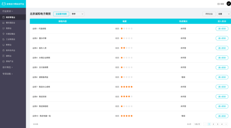 “多行业、多岗位、技能专项训练的实训思维,分为行业实训、岗位实训和专项实训,包含23个行业,18个岗位,1200+技能的综合性平台。学员能够在一个企业中演练全盘账,快速提升系统财务技能。”