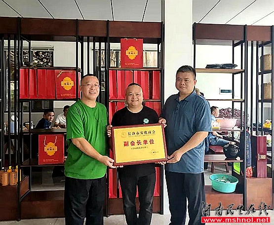 ▲胡国安会长(左)与安化县政协副主席、工商联主席刘畅术(右)为欧阳为福董事长(中)授牌