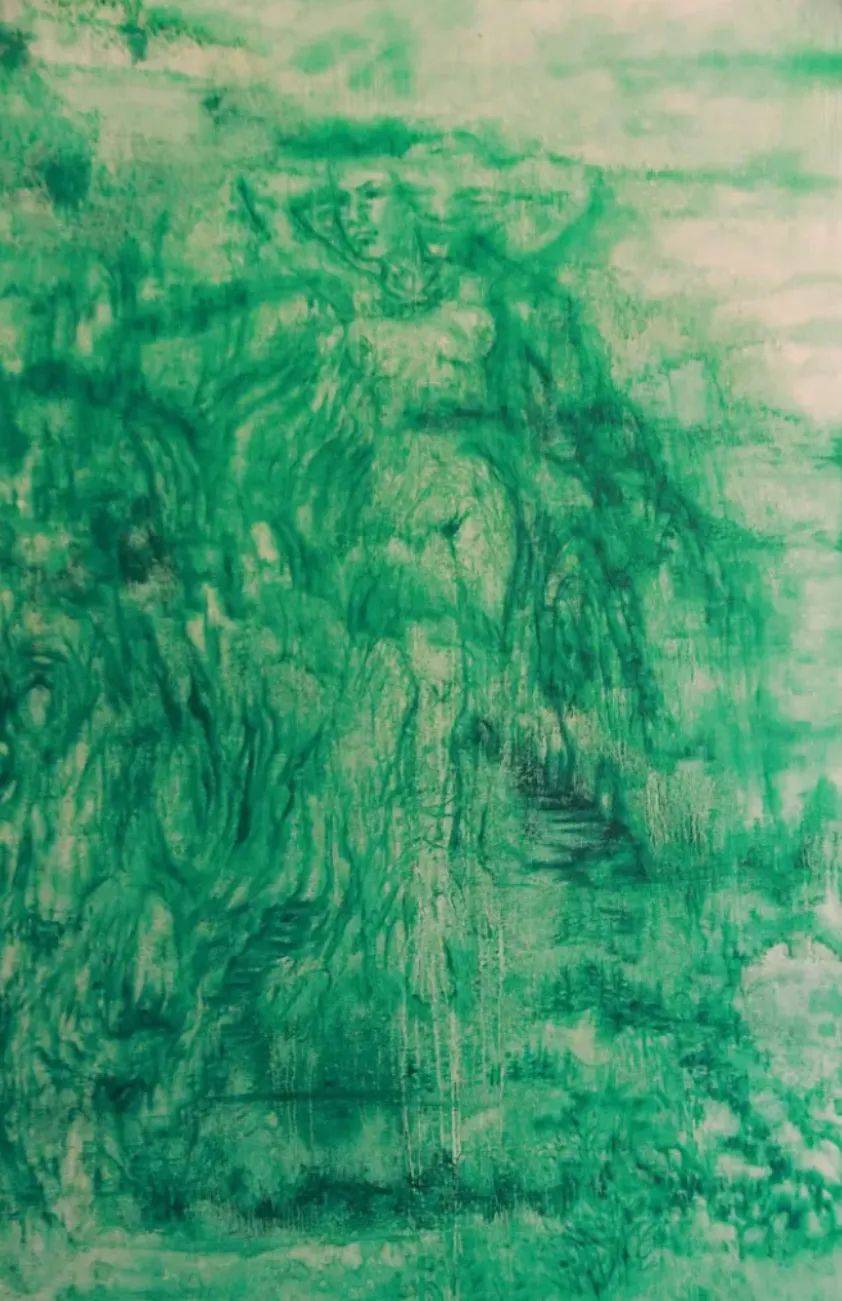 “道法自然”的态势同样流露在油画制作的层面上,如水墨画自然流淌、随意氲化、斑驳而沉着的底色,薄薄地依附在画布上,并局部的保留下来,与具体的形象 部分相互映衬,形成虚实相间,又朦胧含蓄的画意。“花非花雾非雾,夜半来天明去。来如春梦几多时?去似朝云无觅处。”(白居易:《花非花》),技巧上的应 用呼应着主题和内容,将大自然做女性的比喻,她不再是慈祥的母亲,肥沃土地的象征,也不再是天真的少女,生机活力的隐喻;在陈源初画面中反复出现的裸女,就有如被伤害,被凌辱的卖笑女子,像白居易诗中写的那样伤感而凄迷,人物形象的唯美气息,映衬在贫瘠的土地上,污秽的山林水泽中,有的还缠绕着美艳的大瓣花卉,伴随着缤纷的落英。