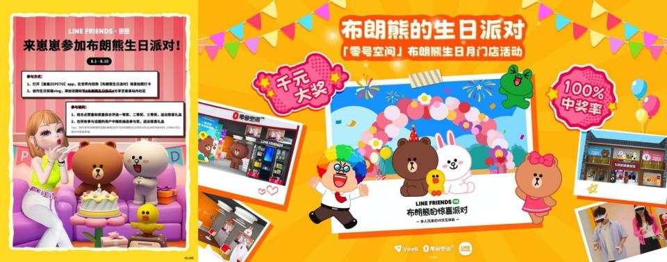 在沉浸式治愈系线下展览之余,LINE FRIENDS亦延续品牌数字化战略,联动优质异界伙伴共创布朗能生日多元数字惊喜。携手虚拟时尚社交平台崽崽ZEPETO,LINE FRIENDS于8月1日至10日在崽崽app限时推出布朗熊生日派对世界,消费者可在app内搜索"布朗熊生日派对”后进入派对世界,通过派对场景打卡拍照、创作布朗熊庆生Vlog等多元化线上玩法感受欢乐趣味的庆生氛围。同时,LINE FRIENDS与全球虚拟现实VR内容行业领军企业VeeR共创的《布朗熊的惊喜派对》VR作品也将在「零号空间」VR沉浸体验馆开启生日月活动,限时推出同行特惠、抽奖福利等惊喜生日礼赠活动,引领消费者们在360°数字化沉浸式梦幻体验中浸入一场布朗熊生日派对的童真温暖潮趣之旅。