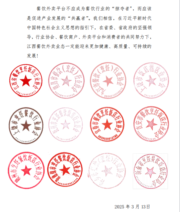 3月15日,江西省餐饮协会发布声明呼吁美团等主流外卖平台降低佣金服务费,还行业健康发展。