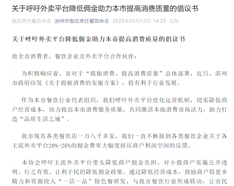 315之际,食品安全引发全社会广泛关注的时刻,江西、陕西、北京、辽宁、山东等五个省市的19家餐饮行业协会纷纷发布公开信,呼吁美团等外卖平台降低抽佣比例,支持民生消费,让好餐厅能活下去。