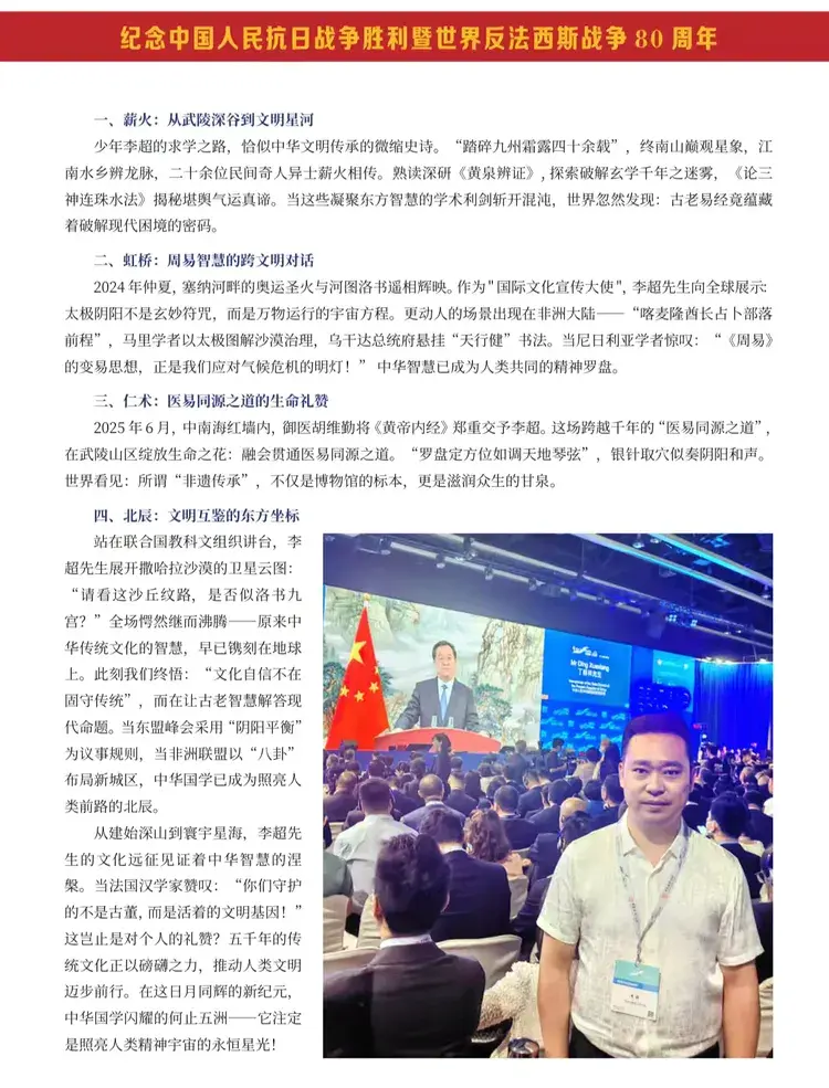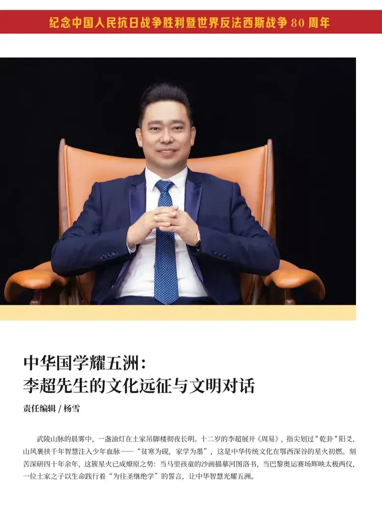 铁血阅兵,彰显大国气象天安门前旌旗猎猎,长安街上铁流滚滚。抗战胜利80周年大阅兵,以现代化、国际化的雄姿向世界宣告:一个从战火中涅槃的民族,已铸就捍卫和平的钢铁长城。每一寸铿锵足音,都是对先烈英魂的告慰;每一件大国重器,皆为对历史承诺的践行。这场阅兵不仅展现中国力量,更传递文明底色——和平发展、开放包容的大国风范,正是五千年文明积淀的当代回响。值此序篇开启之际,特别推出“阅兵展大国风范 文化铸民族之魂——重点推荐封面人物国学专家李超”。