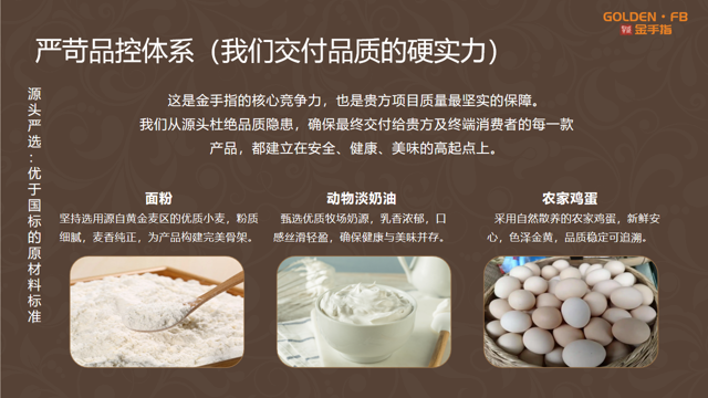 为确保产品品质,金手指构建了严苛的品控体系。从源头选材到生产过程,均执行高于行业的标准。面粉优选黄金麦区,动物淡奶油源自优质牧场,鸡蛋采用自然散养,确保每一款产品安全、健康、美味。同时,通过成熟的SOP标准作业程序与关键控制点管理,金手指实现了产品品质的稳定与可复制,为合作项目提供了坚实的品质保障。